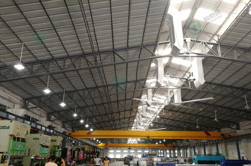 以广州祈信金属制品为例,他们的注塑车间是钢结构设计,厂房面积约有20000多平方米,员工有4000多人。车间里面众多的发热源持续不断的工作,不仅造成车间高温闷热,另外设备中的切削液也会有一些油雾弥漫在空气中,造成异味和细微的悬浮物,危害人体健康和影响车间的工作环境。